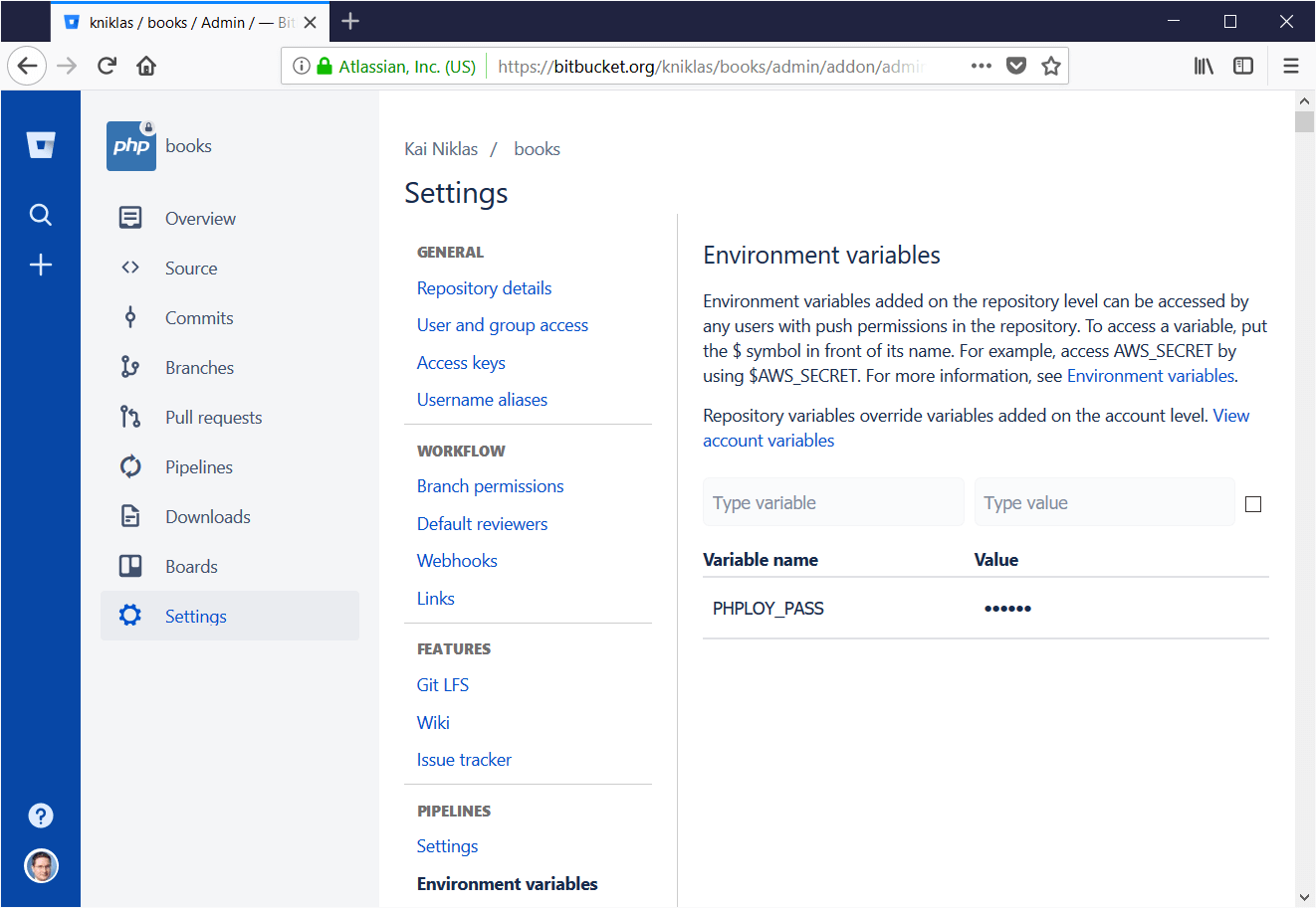 composer require --dev phpunit/phpunitOur goal is to push updated code to a shared hosting provider via FTP if the code builds and all tests pass. Therefore, we first need to store (securely) the credentials to our build server (the pipeline in Bitbucket). We will do this using environment variables instead of hard coded values in the build script.