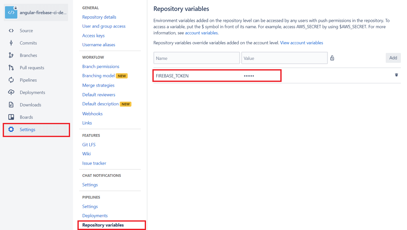 firebase login:ciThe token we put into out pipeline in Settings > Pipeline > Repository variables.